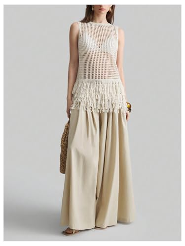 • Feature: Hollow Out, Round Neck, Sleeveless, Fringe Hem, Crochet Knit, Solid, Long Length, Lightweight Sweater Tops for Women