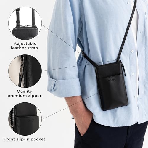 • MINI & PRACTICAL. The Kim is a stylish leather crossbody phone case, perfect for everyday wear. The adjustable leather strap with a metal buckle lets you wear it as a crossbody, shoulder bag, or even as a phone wallet. The main compartment fits your cell phone, while two card slots and slip-in pockets - inside and out - offer extra organization. Dimensions: 7.5" x 4.3" x 1.8".