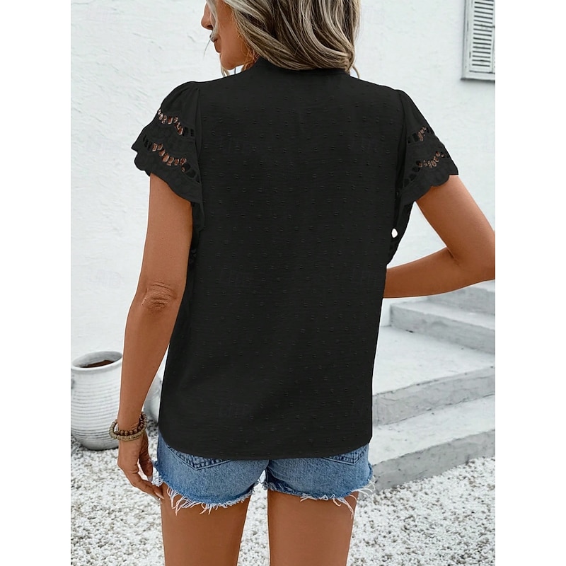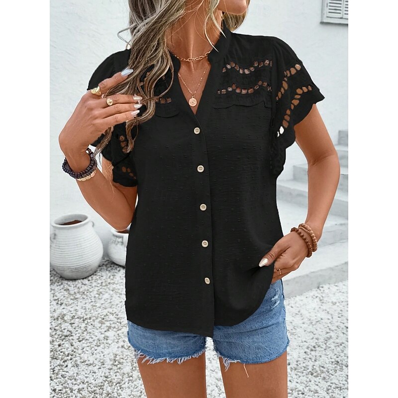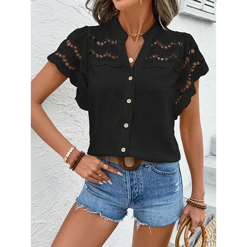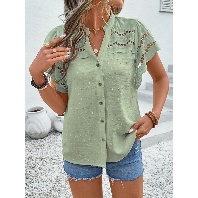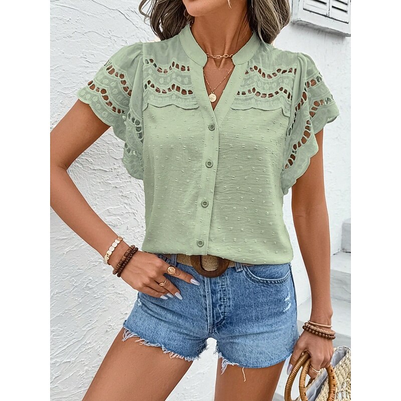 More information about Women's Lace Shirt Solid Color Stylish Casual Short Sleeve V Neck Regular Tops Daily Lace Patchwork Buttons Black Pink Sky Blue Green Apricot Summer