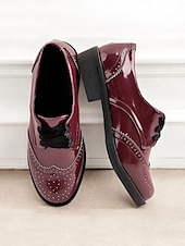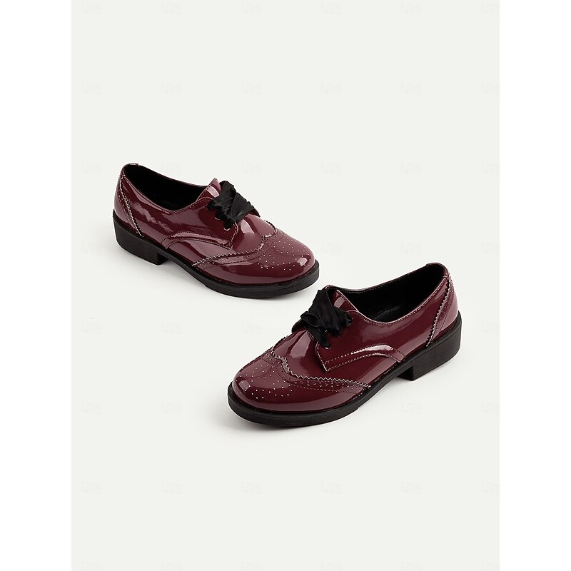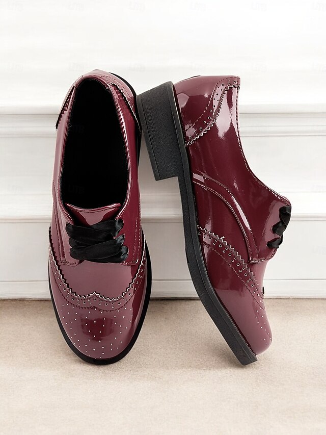 Highlights [Fabric] Crafted from high-quality PU, these women's oxford shoes feature a synthetic leather lining, offering a glossy, patent finish that adds a polished touch to your ensemble. The rubber outsole ensures durability and comfort throughout the day. [Fit] These oxfords have a lace-up design that provides a secure fit with a chunky heel for added comfort, making them suitable for extended wear. [Design Highlights] Featuring a timeless vintage style with intricate brogue detailing along the edges, these shoes blend classic elements with a modern flair. The elegant burgundy color combined with the subtle sheen of the patent leather creates a sophisticated and stylish look. [Occasions] Perfect for daily wear or work settings, these shoes effortlessly transition from casual to formal occasions. Whether attending business meetings or weekend gatherings, they make a versatile addition to any outfit. [Size Recommendations] Available in a variety of sizes, from US5.5 / EU35 / UK3.5 to US10.5 / EU42 / UK8.5, choose your usual size for the best fit.