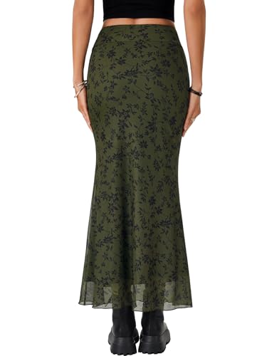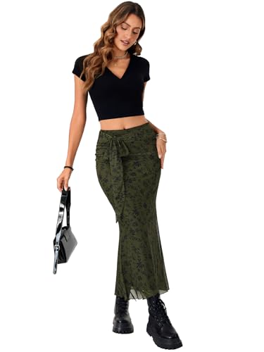 Rooscier Women's Floral Print Mesh Long Skirt High Waist Tie Fishtail Bodycon Maxi Skirts 1