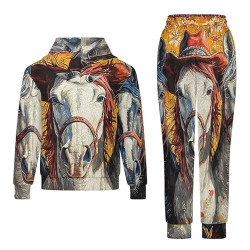 Boys Girls Pullover Hoodie and Pants Outfit 2PCS Set Sweatshirt for Kids, Western Cowboy Horse West Art 2