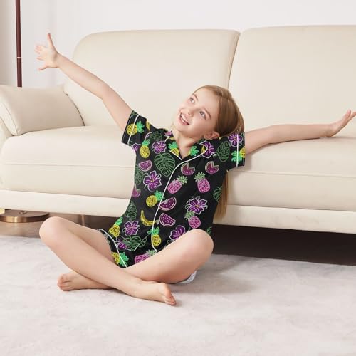 ALAZA Neon Watermelon Pineapple Black Satin Pajamas Set Short Sleeve Button Down Sleepwear Summer Pjs 2 Piece 7
