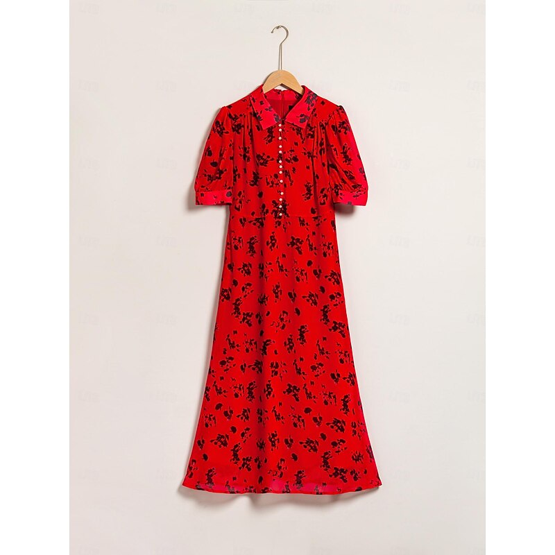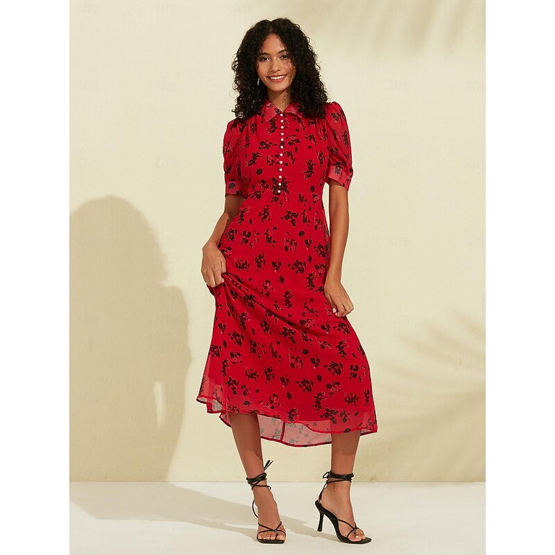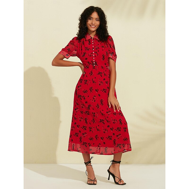 Highlights - Elegant chiffon fabric - Short puff sleeves add a stylish touch - Perfect for women's date nights or vacations - Features a chic printed design - Classic shirt collar neckline - Flattering midi dress length