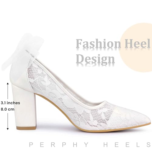 Perphy Pointed Toe Bow Bridal Block Heel Lace Pumps for Women 6