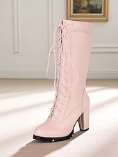 Women's Red Faux Leather Lace-Up Knee-High Boots, 1950s Retro Chunky Heel Combat Booties for Cosplay, Parties & Winter Fashion 22
