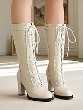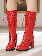 HOT ! Women's Red Faux Leather Lace-Up Knee-High Boots, 1950s Retro Chunky Heel Combat Booties for Cosplay, Parties & Winter Fashion