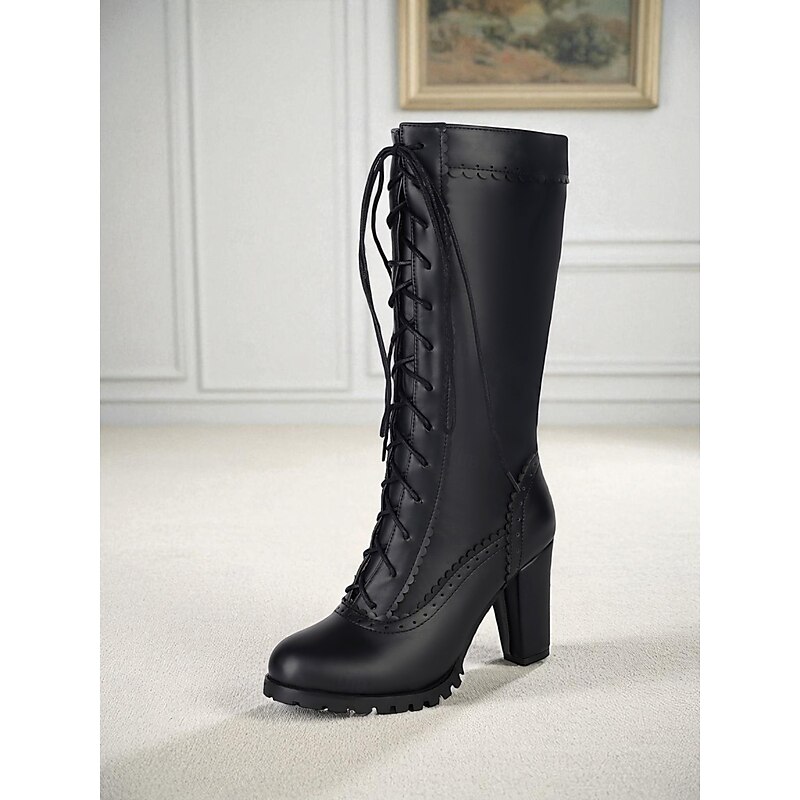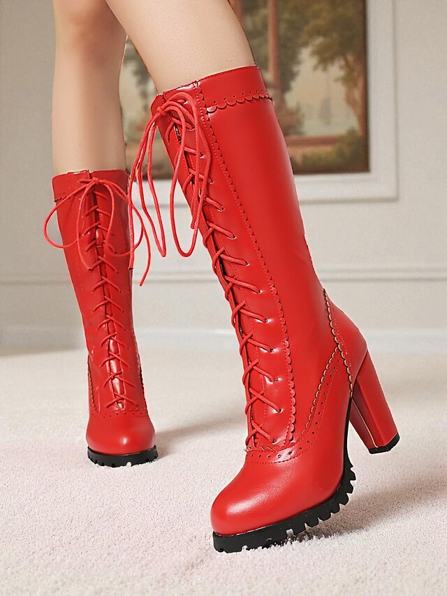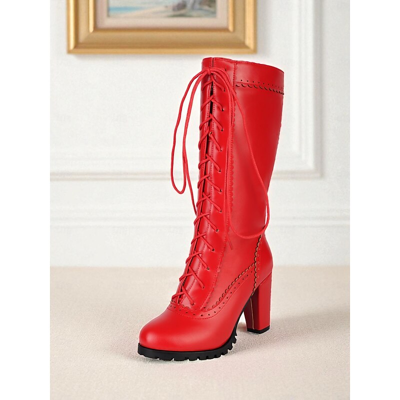 Women's Red Faux Leather Lace-Up Knee-High Boots, 1950s Retro Chunky Heel Combat Booties for Cosplay, Parties & Winter Fashion 21