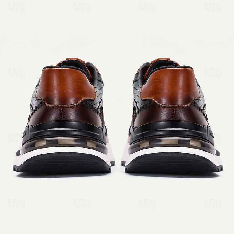 Highlights [Fabric] Crafted from 100% premium cowhide leather, these men's sneakers provide a luxurious and durable finish that elevates your everyday look. The leather lining ensures a comfortable and smooth feel against your skin, ideal for extended wear during colder seasons like fall and winter. [Fit] These sneakers feature a classic low-top design with a round toe shape, providing a stylish yet comfortable fit suitable for daily and home occasions. The cushioned midsole and slightly elevated heel offer support and ergonomic comfort throughout the day. [Design Highlights] The sneakers boast an elegant color block design, incorporating sophisticated tones of brown and dark green. Intricate stitching and perforated detailing enhance visual appeal while improving breathability. The black laces and padded interior ensure a secure and comfortable fit, while the rubber outsole with a patterned grip offers slip resistance and excellent traction. [Occasions] Perfect for daily wear and adaptable to both casual and semi-formal settings, these sneakers suit a range of occasions, from elevating your street style to complementing your smart-casual outfits. Whether you're at home or out for a casual event, these shoes offer both fashion-forward appeal and everyday practicality. [Size Range] Available in a comprehensive range of sizes from US6/EU39/UK5 to US13/EU46/UK12, these sneakers cater to various foot sizes, providing a perfect fit for a wide audience.