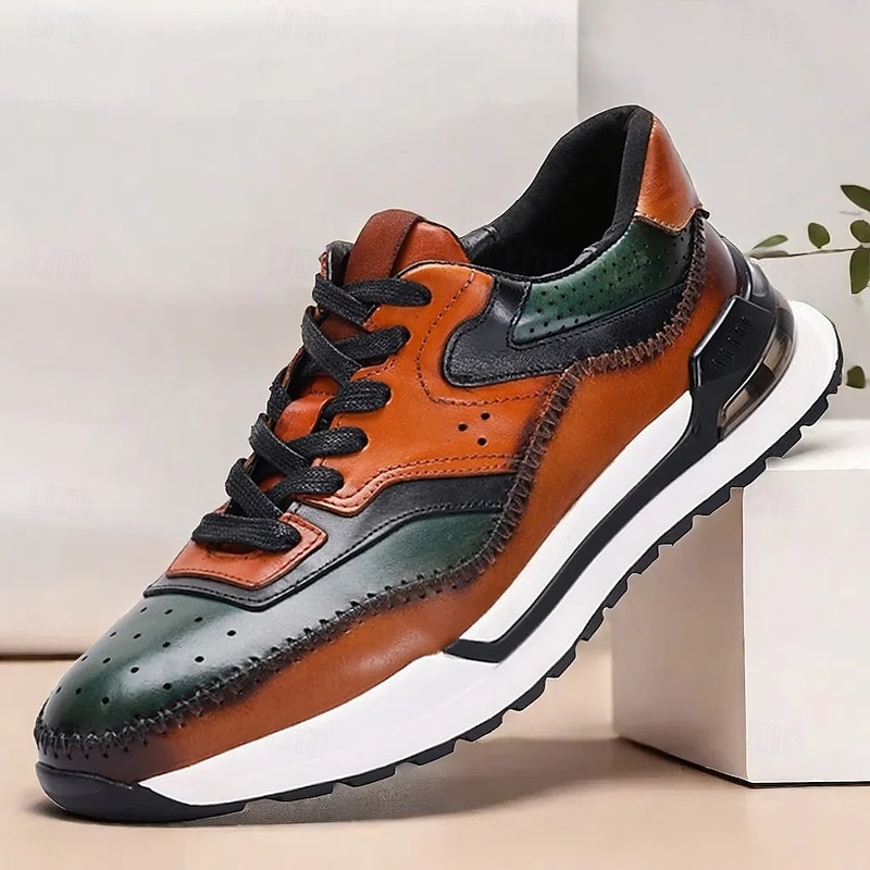 HOT ! Men's Premium Cowhide Leather Sneakers – Vintage Lace-Up Casual Shoes with Color Block Design for Everyday and Fashion Wear