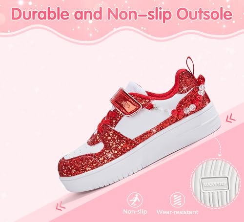 • 【Slip-on Design】:Our girls' glitter tennis shoes feature a hook and loop design, ‌making it incredibly easy for kids to put them on and take them off‌.