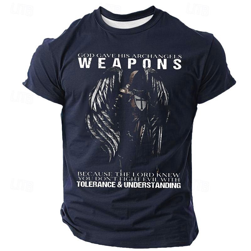 The T-shirt features a striking 3D print of the Knights Templar with a captivating graphic of an archangel in armor, symbolizing strength and protection. The bold print in black, blue, or green hues is paired with a powerful text that reads, "God gave His archangels weapons… Because the Lord knew you don’t fight evil with tolerance and understanding," rendered in engaging white and gray tones.
