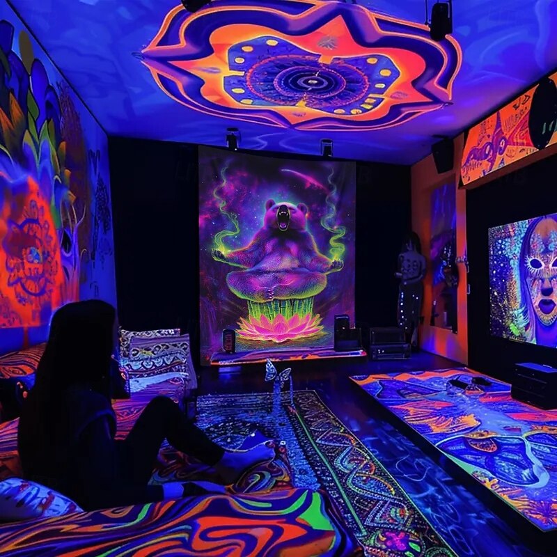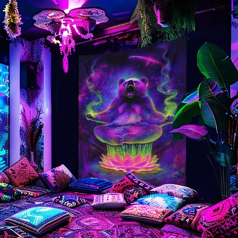 HOT ! Blacklight Tapestry Glow in the Dark Glow Party UV Reactive Meditation Bear Animal Trippy Misty Hanging Tapestry Wall Art Mural for Living Room Bedroom