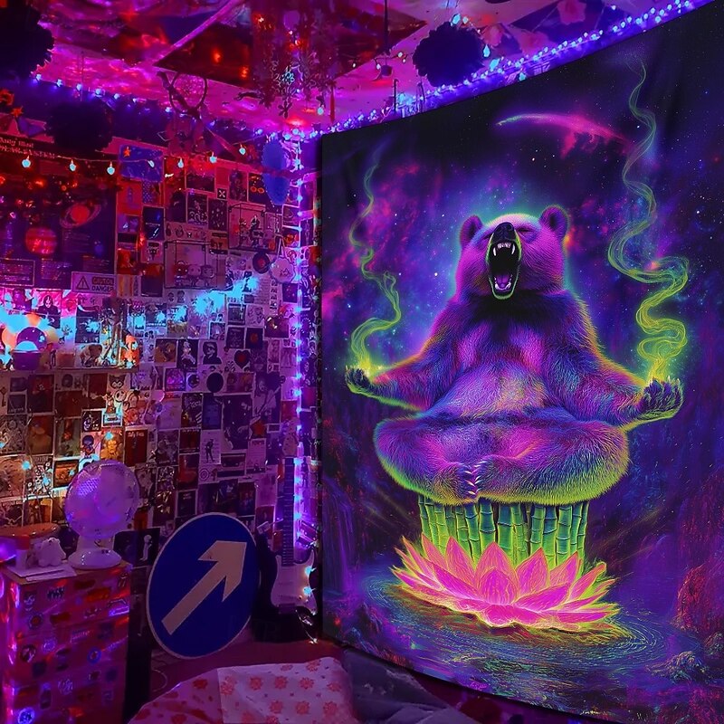 Blacklight Tapestry Glow in the Dark Glow Party UV Reactive Meditation Bear Animal Trippy Misty Hanging Tapestry Wall Art Mural for Living Room Bedroom 17
