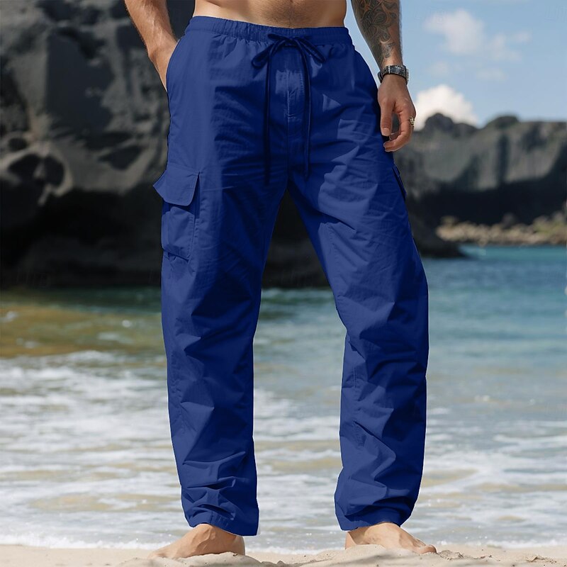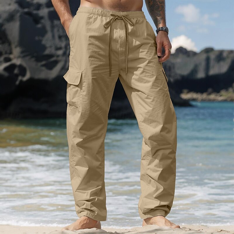 HOT ! Men's Cargo Pants Linen Pants Trousers Summer Pants Drawstring Elastic Waist Multi Pocket Plain Comfort Breathable Full Length Casual Daily Holiday Vacation Fashion Black White Inelastic