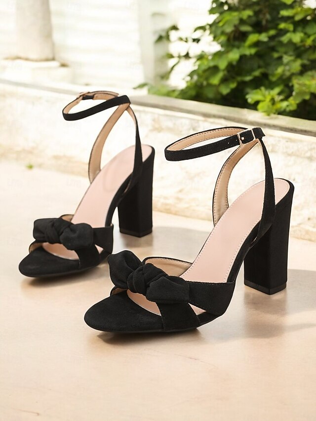HOT ! Women's Black Block Heel Sandals – Ankle Strap Slingbacks with Bow Accent for Casual Dates and Urban Chic