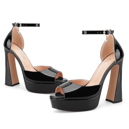 Women's Chunky Platform Heels Patent Leather Block Heeled Sandals Open Peep Toe Dressy Shoes with Ankle Strap Buckle and Rhinestone for Ladies Sexy Summer 5 Inch 4