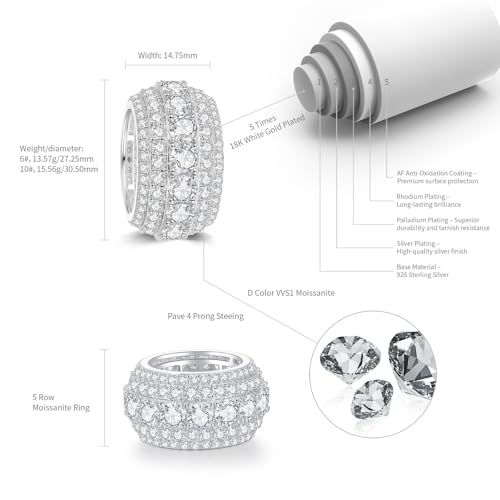 • 【Unique Design】:The design of this wedding band is bold and exaggerated.It is composed of 5 row moissanite and has a width of 14.5mm.It will attract attention no matter what occasion it is worn and become the focus of the audience.Each Moissanite is hand set using a prong setting to ensure the gemstone is more secure and will not fall off easily