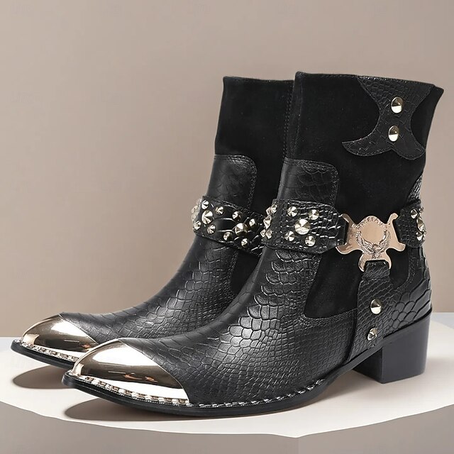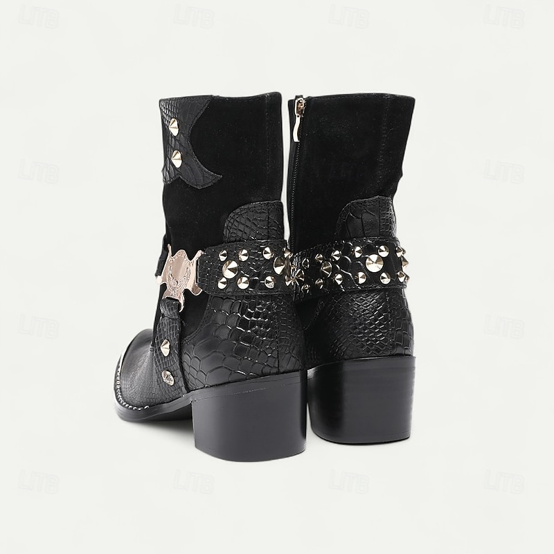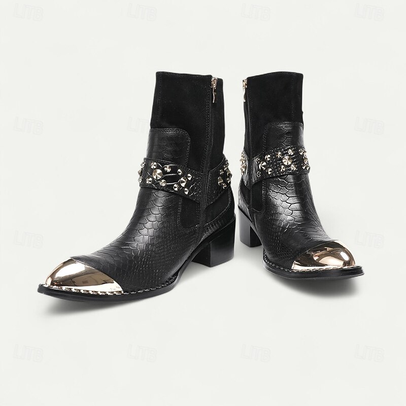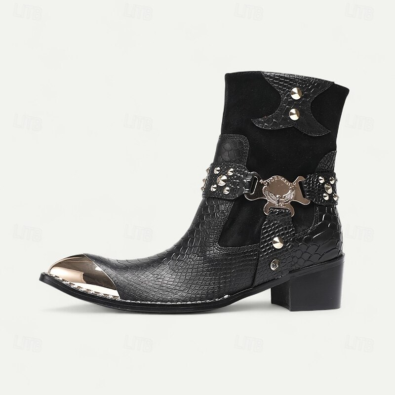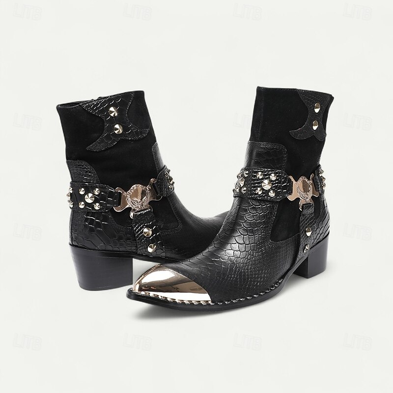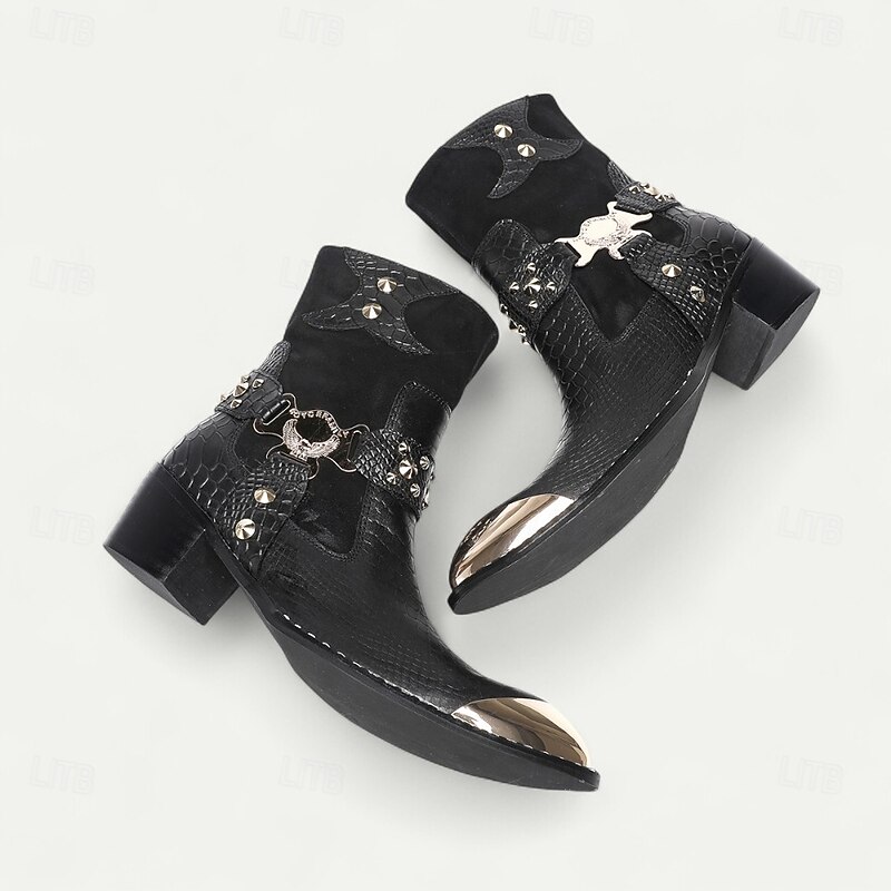 More information about Men's Black Leather Ankle Boots with Studded Straps and Metal Toe Caps - Stylish Western Boots for Formal and Casual Occasions