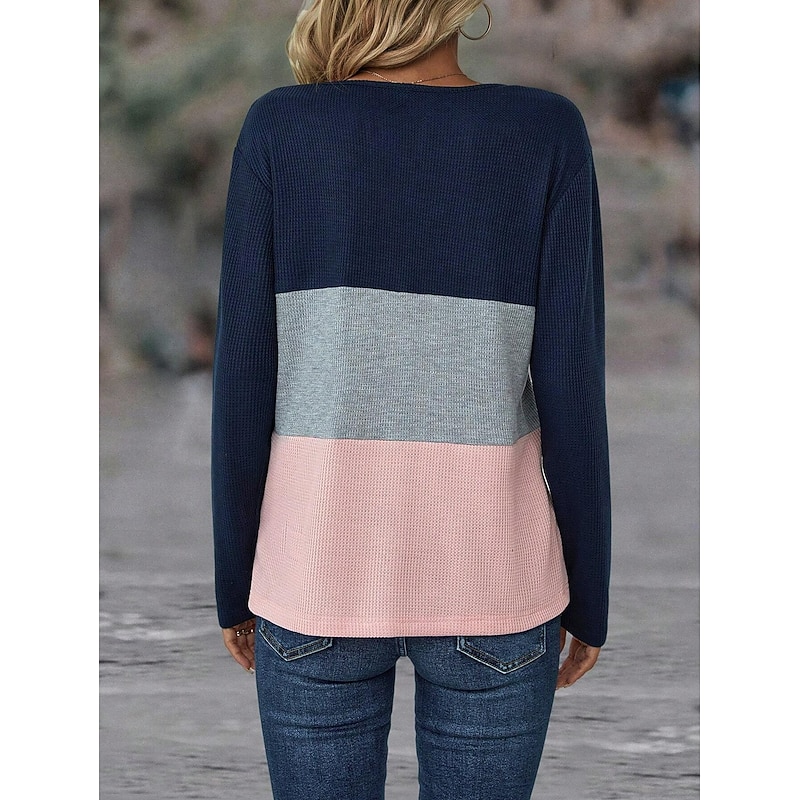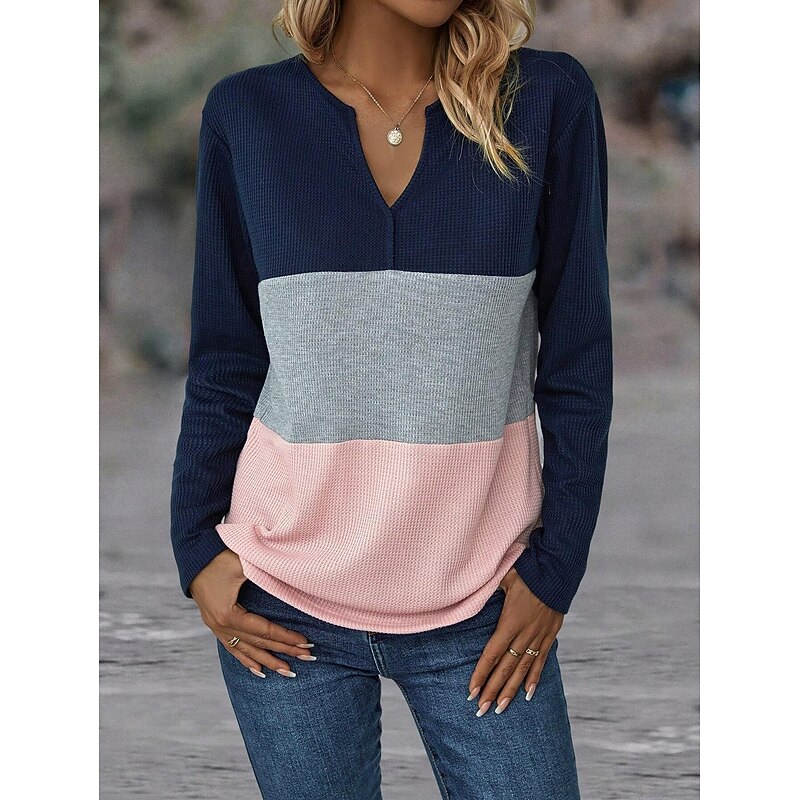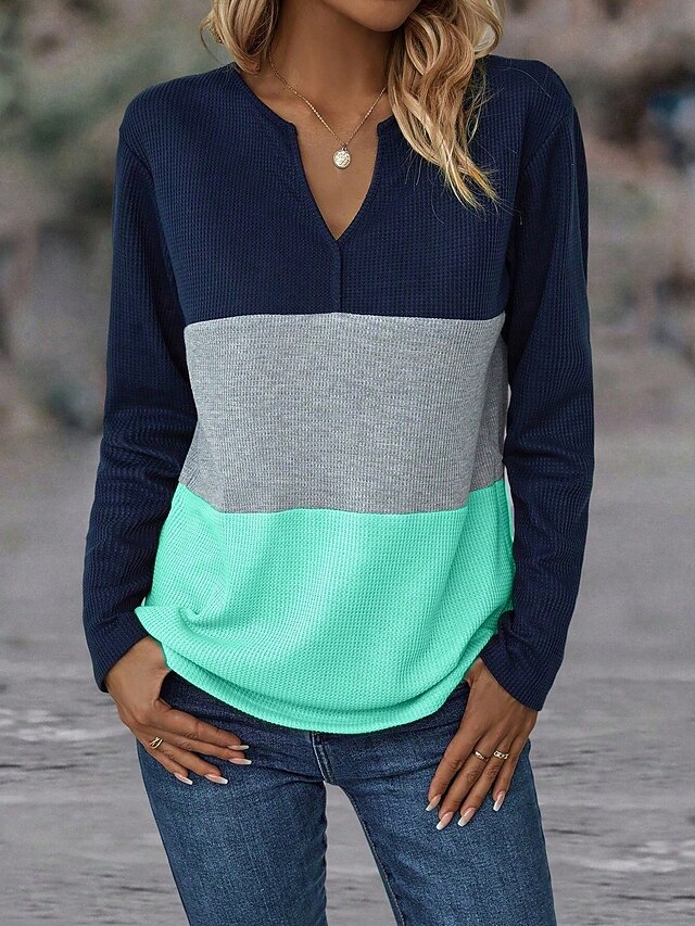Highlights [Fabric] : Made from a cozy polyester blend, this women's T-shirt features a soft waffle-knit texture, providing comfort and warmth for the colder seasons. The material is micro-elastic, ensuring a snug yet flexible fit suitable for everyday wear. [Fit] : Designed as a regular fit, this long-sleeve top offers a relaxed and comfortable silhouette. The regular length makes it easy to pair with a variety of bottoms, from jeans to shorts, offering versatility for your wardrobe. [Design Highlights] : Featuring a casual notched V-neckline, the T-shirt adds a modern touch with its color-block design, combining dark navy, light gray, and vibrant mint green sections. This stylish combination adds both visual interest and a contemporary flair to the piece. [Occasions] : Perfect for daily wear and weekend outings during fall and winter, this top is a great choice for casual settings where comfort and style are equally important. Its versatile design ensures that it complements various casual occasions seamlessly. [Size Range] : Available in sizes S, M, L, and XL, this T-shirt caters to a range of body types, offering options for a comfortable and flattering fit for every wearer.