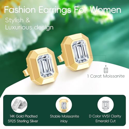 LEONIDS 1 Carat Emerald Cut Moissanite Earrings For Women | D Color VVS1 Clarit 925 Sterling Silver 14K Gold Stud Earrings | Birthday Jewelry Gifts for Her Mom Wife 1