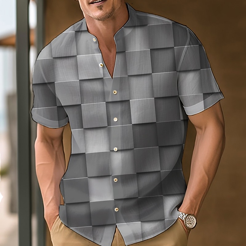 Highlights We're thrilled to collaborate with The Laundry Room to unveil a stylish limited-edition Men's Shirt With captivating geometry and plaid check graphic prints this micro-elastic Polyester shirt in diverse colors features a unique stand collar short sleeves and is both machine and hand washable Just like you it's one of a kind!