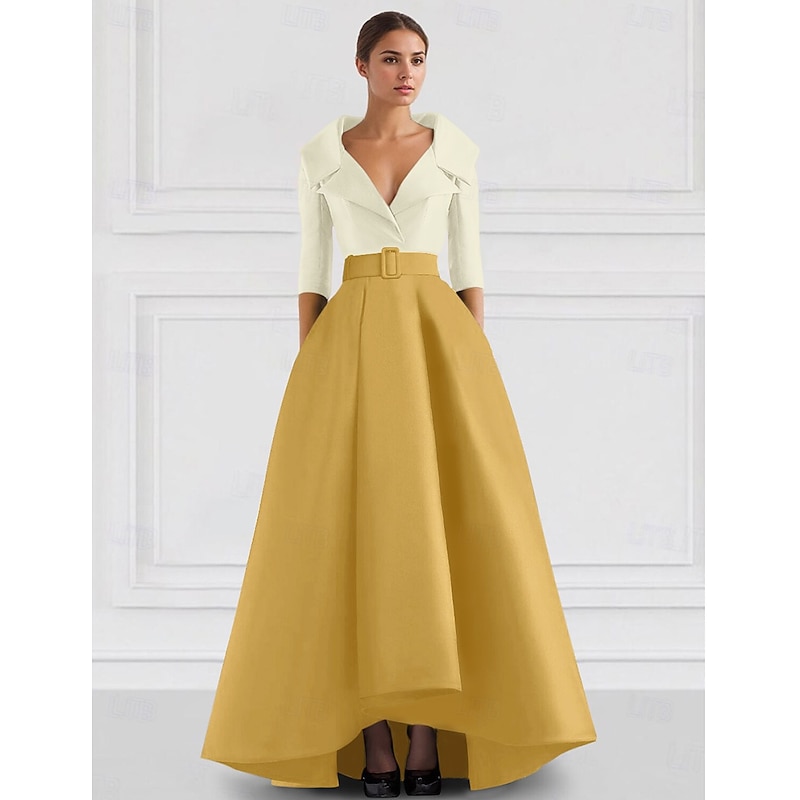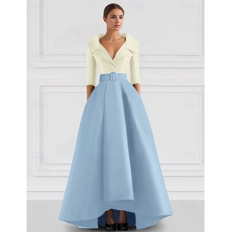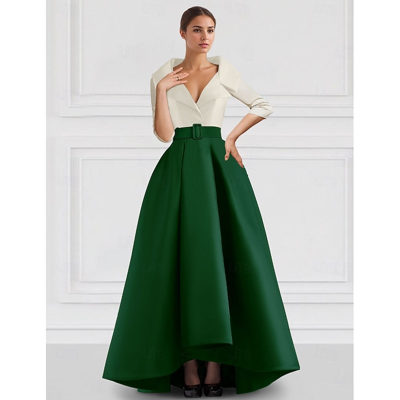 HOT ! Red A-Line Satin Formal Evening Gown Elegant Fall Wedding Guest Dress Tuxedo Dress Asymmetrical 3/4 Length Sleeve Shirt Collar with Pocket