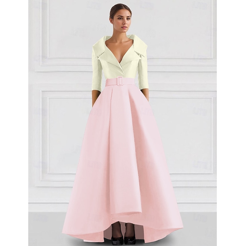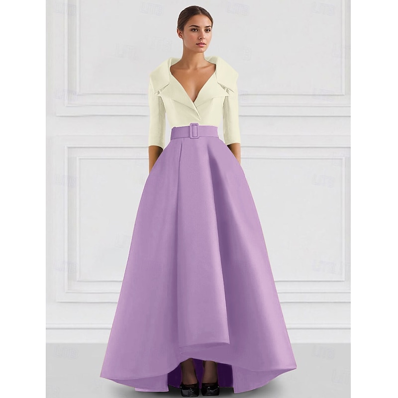 Red A-Line Satin Formal Evening Gown Elegant Fall Wedding Guest Dress Tuxedo Dress Asymmetrical 3/4 Length Sleeve Shirt Collar with Pocket 1