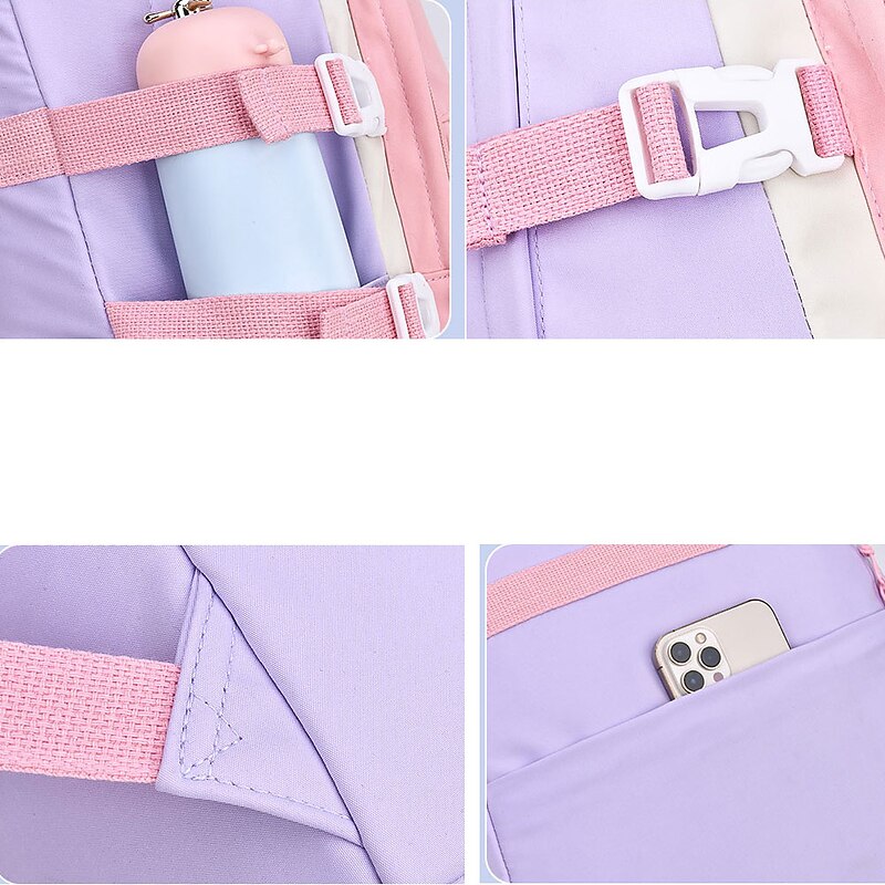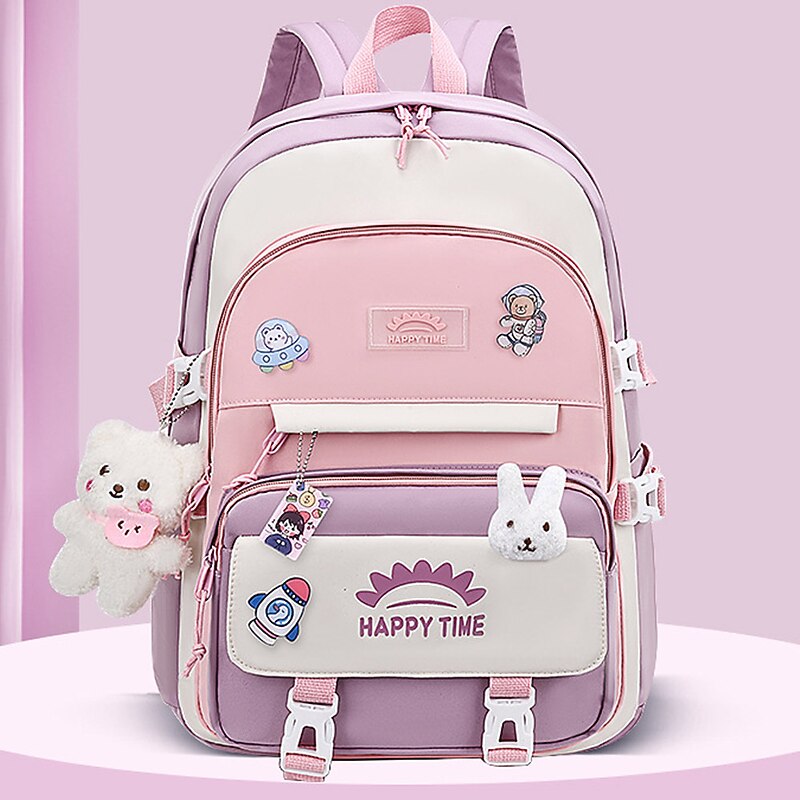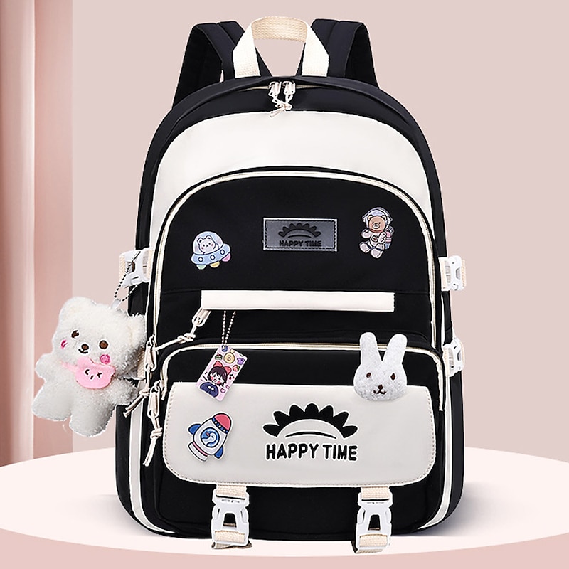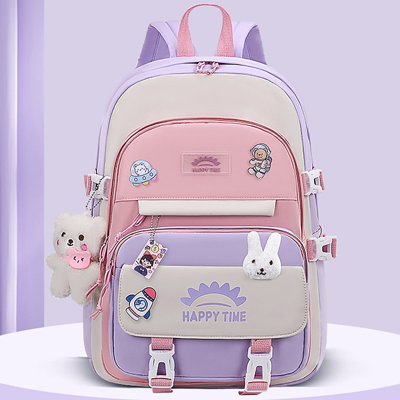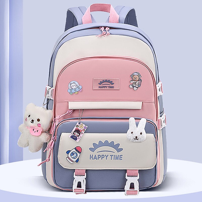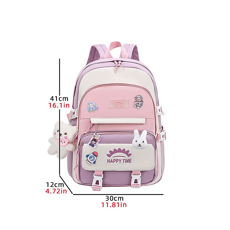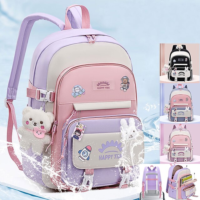 Girls' Waterproof School Backpack with Cute Bear Pendant and Cartoon Patches – Lightweight Bookbag for Elementary or Middle School Students