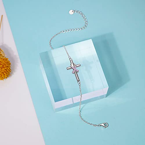 HOT ! 925 Sterling Silver Breast Cancer Awareness Bracelet Cross Pink Ribbon Bracelet Breast Cancer Survivor Gifts for Women