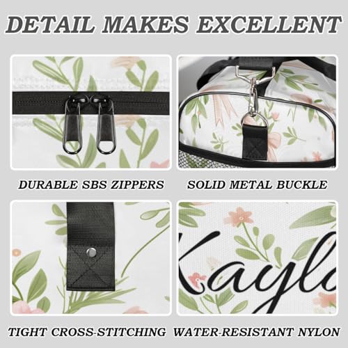 Pink Flower Custom Travel Bag, Personalized Duffle Bag with Initials Name, Green Leaf Sports Dance Gym Tote Bags Weekender Overnight Bags for Women Men 6