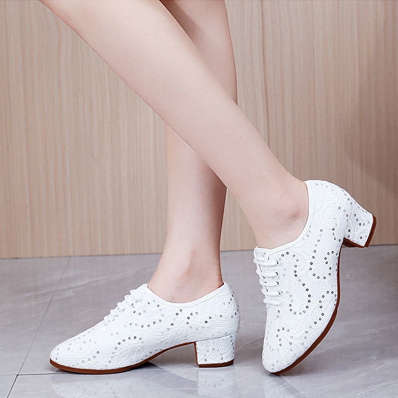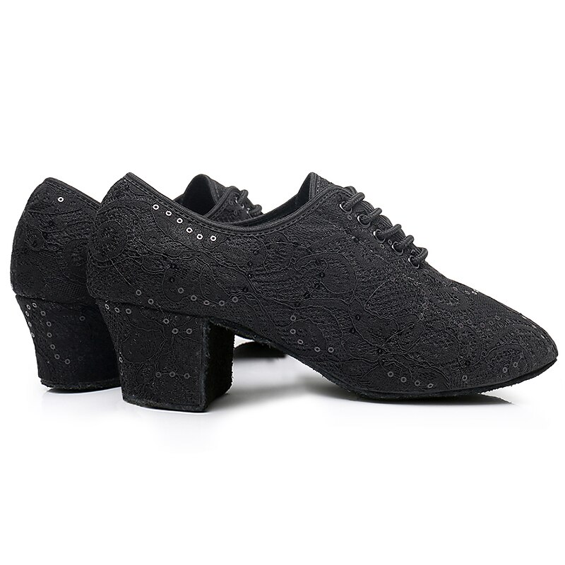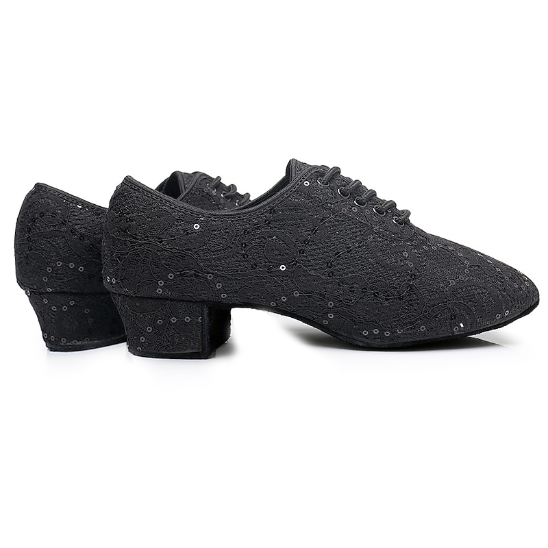Highlights [Fabric and Material] : Crafted from a soft mesh upper adorned with sparkling sequins, these women's dance shoes offer an exquisite blend of elegance and durability. The suede outsole provides a secure grip, perfect for gliding effortlessly across the dance floor. [Silhouette and Fit] : These shoes feature a classic round-toe shape and a mid-heel design, available in two comfortable heel heights: 1.38 inches (3.5 cm) and 2 inches (5 cm). This silhouette ensures both style and ease of movement during extended dance sessions. [Design Highlights] : The lace-up closure complements the intricate lace and sequin embellishments, providing both a secure fit and an elegant touch. The shoes boast a softer insole for maximum comfort, allowing you to focus on your performance without distraction. [Occasions] : Ideal for indoor and professional settings, these shoes are perfect for Latin and ballroom dance practices, competitions, and formal occasions. Whether you're dancing the night away at an event or refining your technique in a practice session, these shoes are a versatile and stylish choice. [Size Range] : These dance shoes cater to a wide range of sizes, available in sizes 34 to 42. With options tailored for a comfortable fit, they are suitable for adult women seeking both functionality and fashion in their dance footwear.