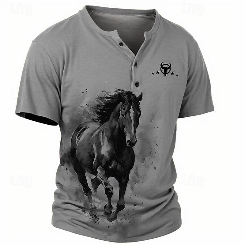Men's Graphic Horse Faith T shirt Henley Shirt Tee Top Short Sleeve 3D Print Classic Casual Sports Outdoor Holiday Going out Spring & Summer Blue Khaki Gray Henley Henley T-Shirt