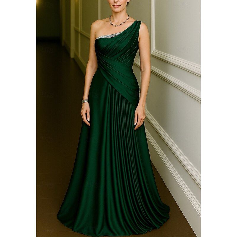 More information about Green Blue A-Line Evening Gown Elegant Dress Formal Wedding Floor Length Sleeveless One Shoulder Stretch Satin with Pleats Ruched 2025