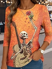UntilTheLastNote By David Lozeau Halloween Women's T Shirt Skulls Crew Neck Long Sleeve Tunic Graphic  Vintage Stylish Classic  Round Neck Regular Tops Daily Print Orange Fall 1