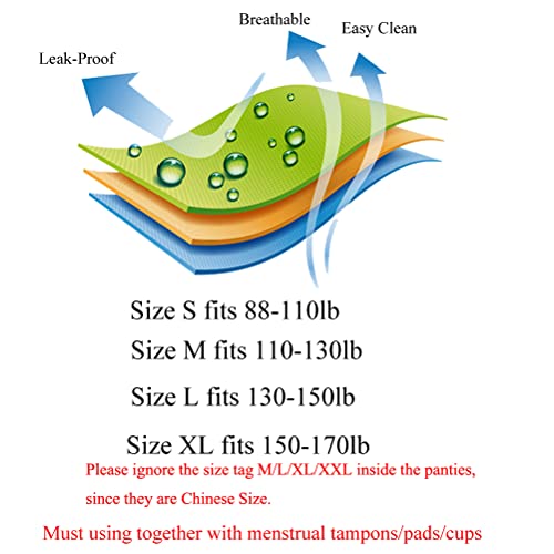 • Value 4 Pack Breathable Period Panties for Girls, Weight Measurement: Size S(Tag M) fits the weight: 88lb-110lb, Size M(Tag L) fits the weight: 110lb-130lb, Size L(Tag XL) fits the weight: 130lb-150lb, Size XL(Tag XXL) fits the weight:150-170lb. Please ignore the size tag M/L/XL/XXL inside the panties, since they are Chinese Size.
