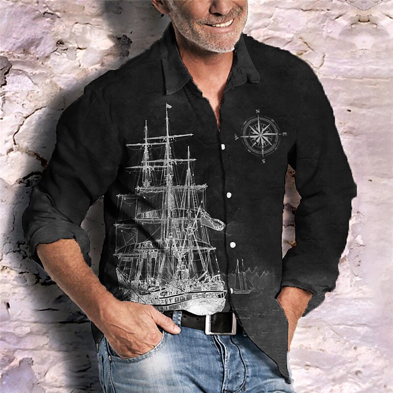Men's Nautical Vintage Sailboat Shirt Button Up Shirt Long Sleeve Vintage Fashion Streetwear Outdoor Casual Daily Summer Spring Fall Turndown Print Black Blue Green Khaki Gray 1