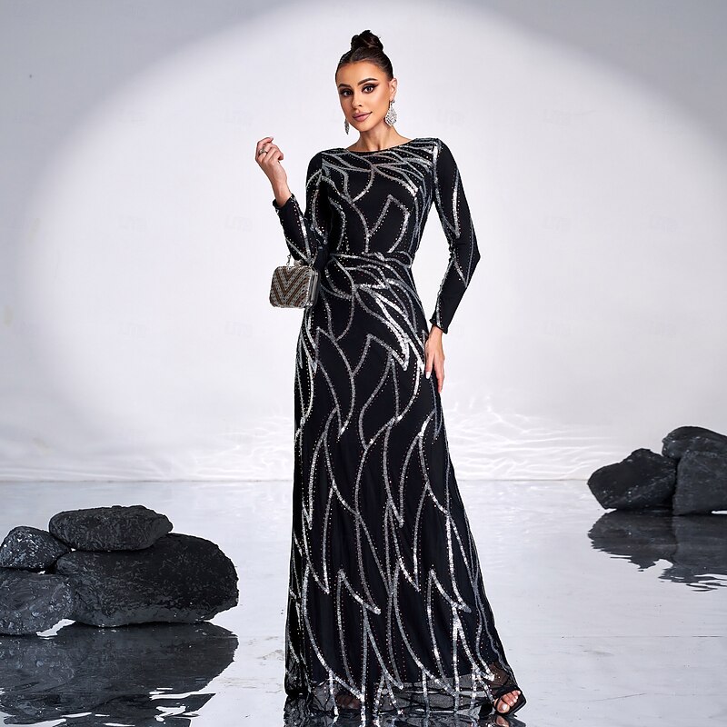 Sheath / Column Evening Gown Vintage Dress Formal Masquerade Floor Length Long Sleeve Jewel Neck Sequined with Glitter Sequin 1