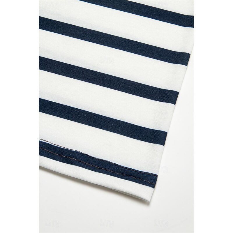 Highlights [Fabric:] Crafted from a high-quality polyester blend, this women’s T-shirt offers a breathable and comfortable wear perfect for the cooler months of fall and winter. Its soft texture ensures it feels gentle on the skin, while the micro-elasticity allows for a relaxed yet flattering fit. [Fit and Style:] Designed with a regular fit, this top features a classic V-neckline, adding elegance and versatility. The long sleeves provide additional warmth, making it a staple for seasonal wardrobes. Its length provides a balanced silhouette, ideal for casual or semi-formal outfits. [Design Highlights:] This T-shirt showcases a chic striped print with the upper section in a solid navy blue, transitioning smoothly to horizontal white and navy stripes. The pattern adds a modern twist to a basic style, making it a versatile choice for various ensembles. [Occasions:] Suitable for daily wear or weekend outings, this top can effortlessly transition from casual to more dressed-up situations. Pair it with jeans for a laid-back look or with a skirt for a more refined appearance, making it perfect for a range of occasions year-round. [Size Range:] Available in a variety of sizes including S, M, L, XL, and 2XL, this T-shirt offers options to accommodate different body types, ensuring a comfortable and stylish fit for everyone.