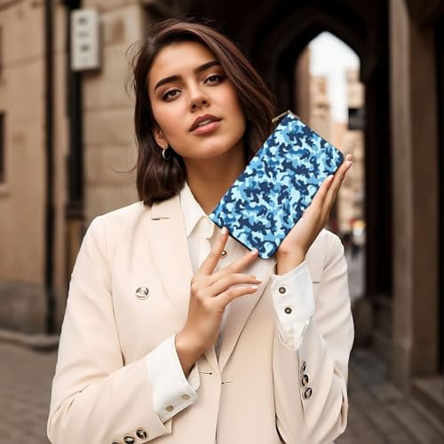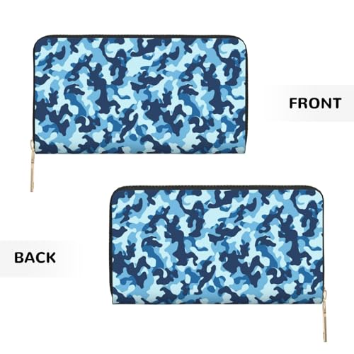 Leather Thin Slim Wallets for Women & Men - Blue Camouflage Print Card Wallet Holder with Zipper 1