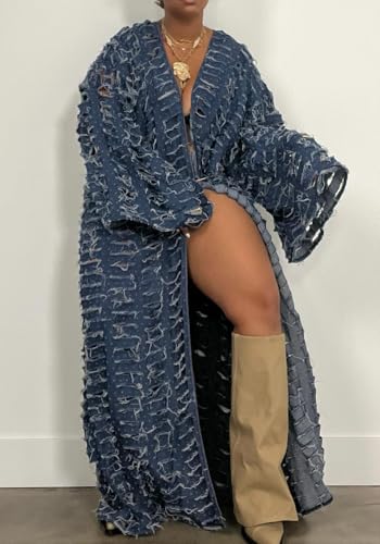 HOT ! NRTHYE Women's Ripped Oversized Jean Kimono Robe Cardigan Hollow Long Sleeve Open Front Long Denim Dusters Jacket Coat