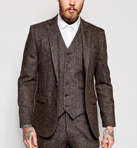 Mens 3 Piece Suits Slim Fit Tweed Herringbone Suit Groom Wedding Prom Tuxedos Set 3