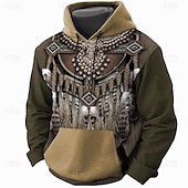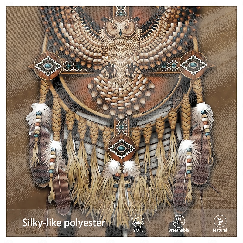 : The hoodie boasts a unique 3D print of an owl motif, enhanced by intricately detailed feathers, beads, and geometric shapes reminiscent of Native American patterns. The contrast between the dark-colored sleeves and vibrant body design makes it a standout piece. The front pocket adds not only a stylish touch but also a practical element for storage and warmth.