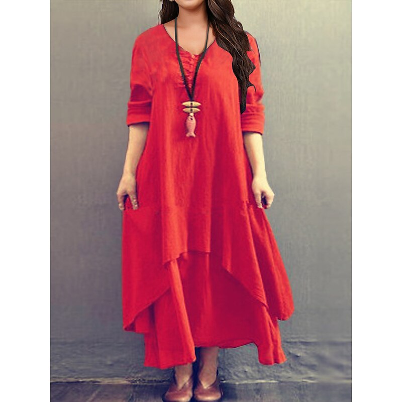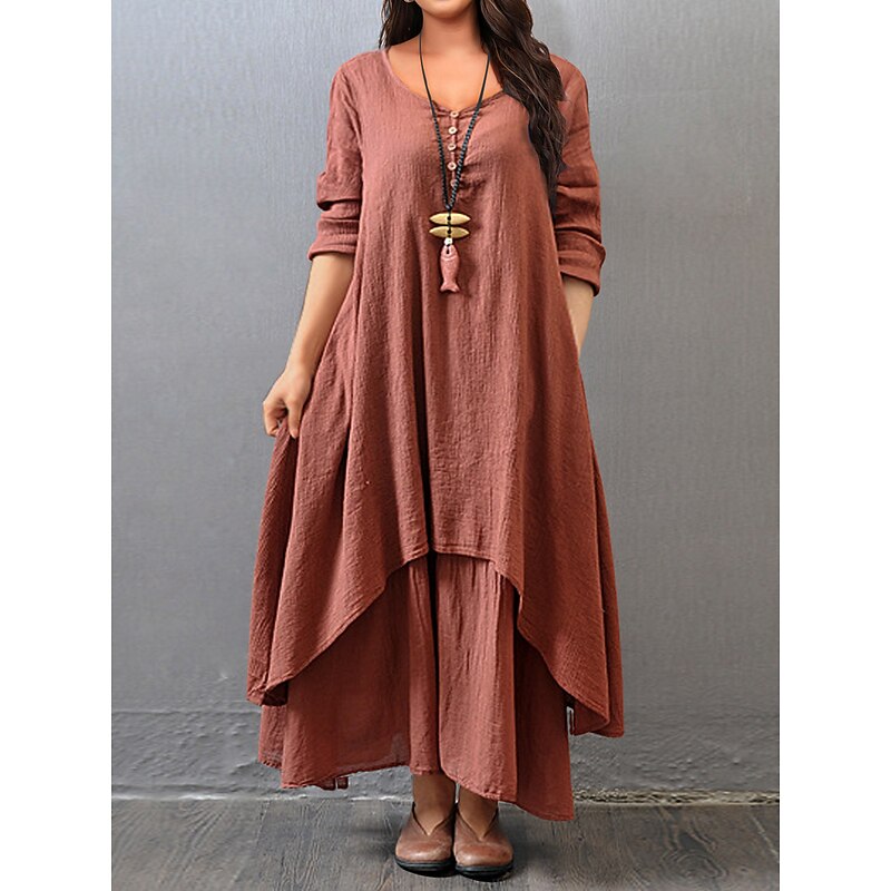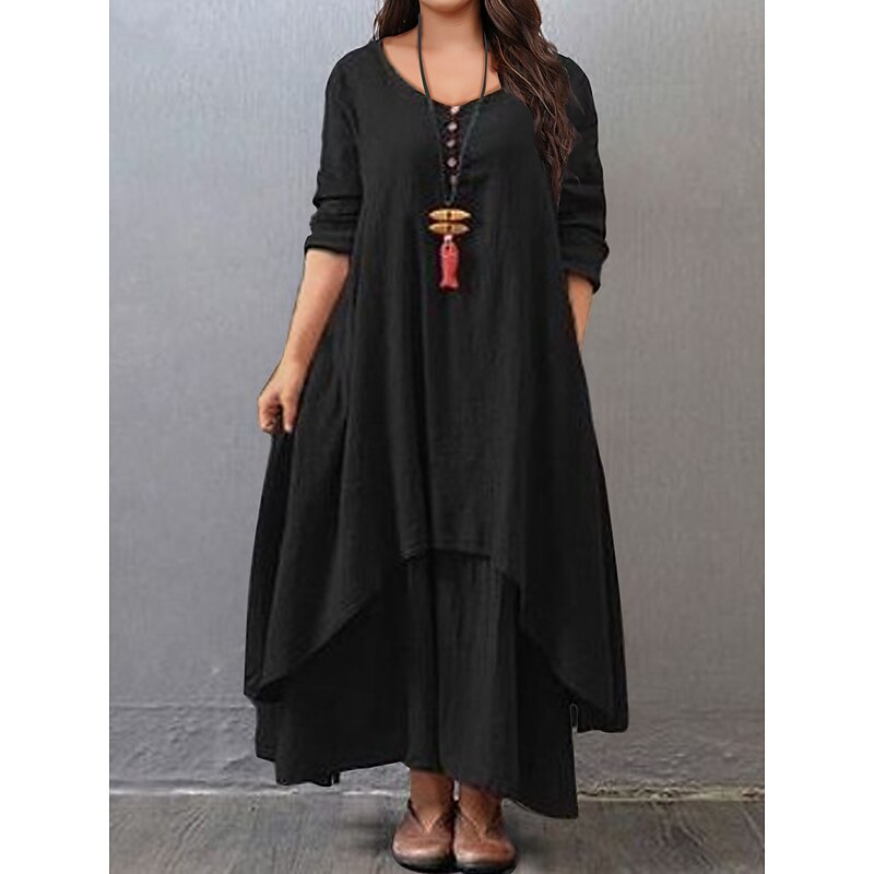 Highlights [Fabric & Material] : Crafted from a breathable cotton linen blend, this dress ensures comfort and ease throughout the day. The lightweight material is perfect for warm weather, providing a micro-elastic fit for added flexibility and movement. [Silhouette & Fit] : Designed with a maxi long length and a regular, A-line silhouette, this dress offers a relaxed fit that effortlessly drapes over different body shapes. Its classic swing design enhances the figure, making it a versatile choice for a wide range of occasions. [Design Highlights] : Featuring a V-neckline embellished with buttons, this dress exudes elegance and sophistication. The unique fake two-piece look creates a layered effect, adding depth and style. Long sleeves that can be rolled up enhance its adaptability across different seasons. [Occasions for Wear] : Ideal for a variety of settings, from daily wear and casual outings to relaxed social gatherings and beach walks. Its classic and mature style offers a timeless appeal, ensuring it remains a staple in your wardrobe across spring, summer, and fall. [Size Range] : Available in a comprehensive range of plus sizes, from L to 5XL, this dress caters to various body types, ensuring a flattering fit for all.