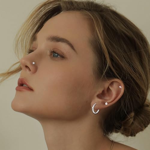 • 【Earrings Sizes】: Cartilage piercing jewelry guages: 20G(0.8mm); Stud bar length: 6mm (0.23in) / 7mm (0.27in) / 8mm (0.3in); Top post sizes: 2mm (0.08 in) / 3mm (0.12 in) / 4mm (0.16 in); flat back cartilage earring for women with different styles and sizes for daily wear, including ball studs, star studs, pentagonal diamond studs and 3 diiferent sizes cubic zirconia studs. Small Hoops:8mm (0.32in), Medium Hoops: 10mm (0.39in), Big Hoops:12mm(0.47in).