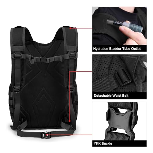 • Hydration Compartment:This tactical assault pack with hydration compartment can hold a 2 Liter hydration bladder,WATER BLADDER IS NOT INCLUDED, and the tube is fed through the top of the shoulder straps