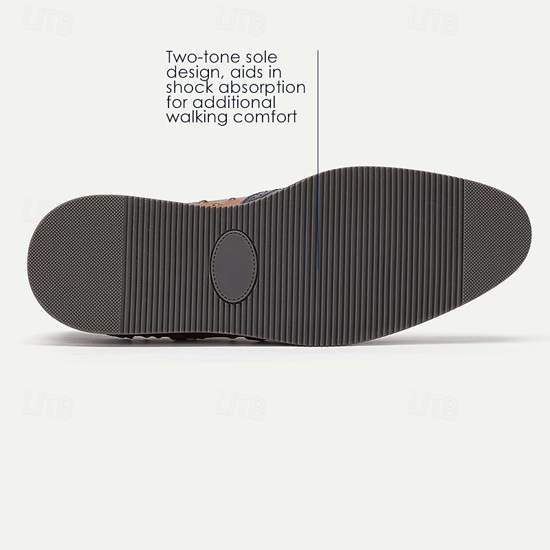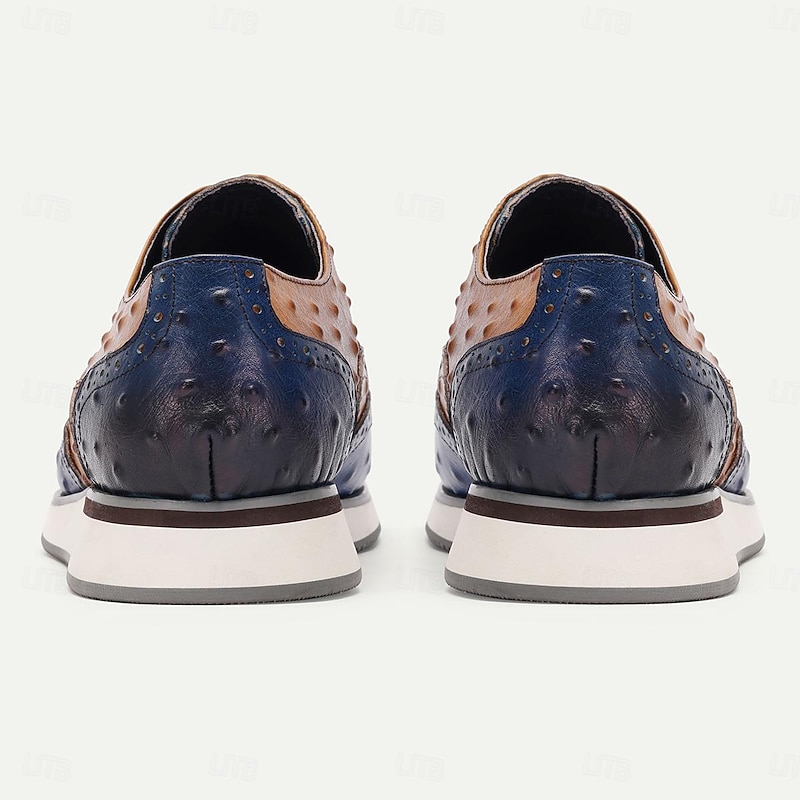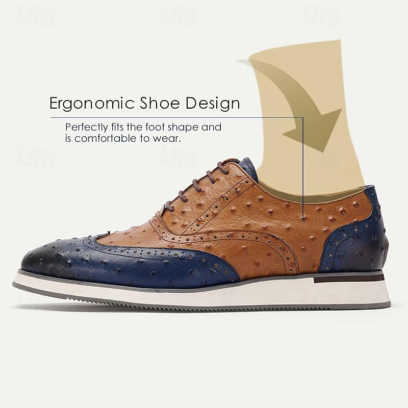 Highlights [Fabric:] Crafted from 100% premium Italian full-grain cowhide leather, these men's dress sneakers offer exceptional durability and an opulent feel. The rich leather detailing elevates the shoe's overall sophistication, making it a stand-out choice. [Style:] These sneakers combine a classic lace-up design with a modern aesthetic, mingling rich brown and deep navy hues for a striking color-block effect. The wingtip and brogue patterns lend a traditional touch, further enhanced by the embossed texture reminiscent of ostrich leather. [Design Highlights:] The sneakers feature intricate bullock carving details, adding a refined elegance. The round toe shape ensures a roomy fit, while the slip-resistant rubber outsole provides superior traction and comfort for all-day wear. [Occasions:] Perfect for business meetings, formal occasions, or upscale casual settings, these sneakers offer a versatile yet fashionable option. They bring a touch of elegance and style to any ensemble, whether you're dressed for an important work event or a chic evening out. [Size Information:] Available in a comprehensive range of sizes from US6 to US13, these shoes cater to a wide audience, ensuring a comfortable fit for a variety of foot dimensions.