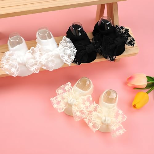 3 Pairs Baby Girls Socks, Lace Bow Non-Slip Grips Sock Toddler Princess Low Cut Ankle Socks for Newborn,Infant 4