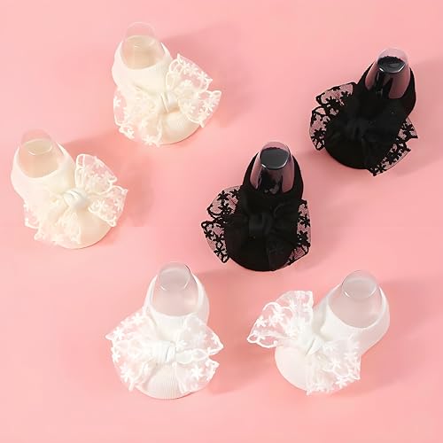 3 Pairs Baby Girls Socks, Lace Bow Non-Slip Grips Sock Toddler Princess Low Cut Ankle Socks for Newborn,Infant 5