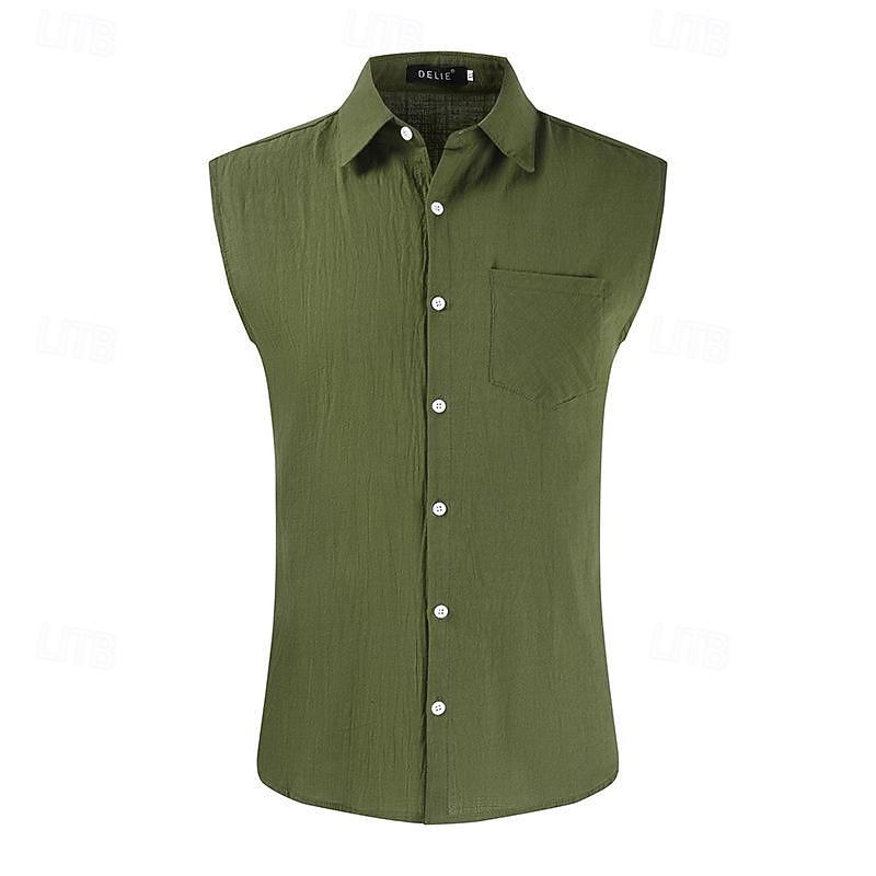 HOT ! Men's Shirt Linen Shirt Cotton Linen Shirt White Cotton Shirt Summer Shirt Beach Shirt Plain Vacation Street Khaki Army Green Sleeveless Lapel Summer Clothing Apparel Front Pocket